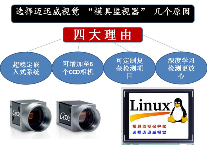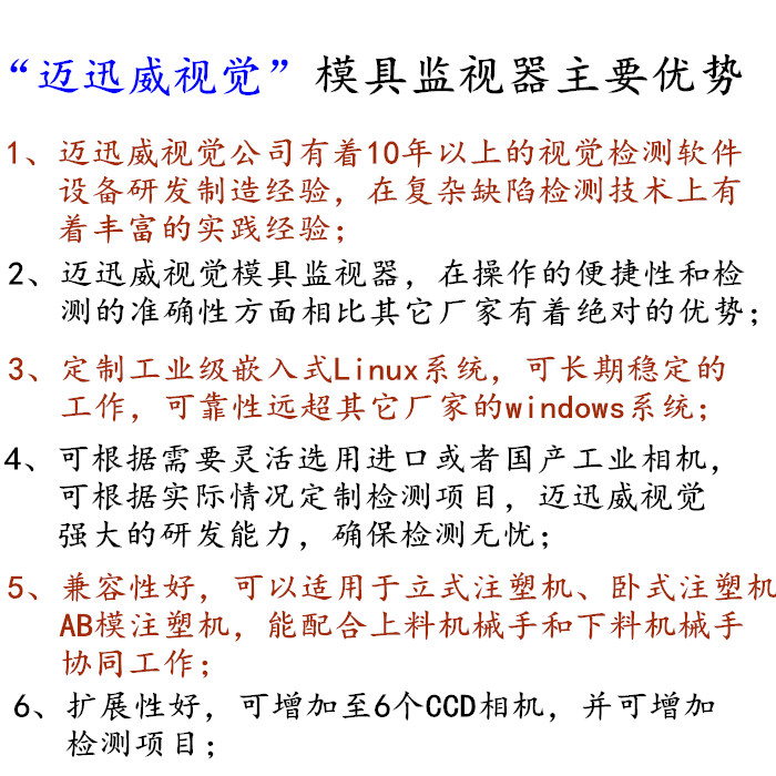 模具監(jiān)視器,模具保護器,注塑機電子眼,在線視覺檢測系統(tǒng),邁迅威視覺公司傾力打造新一代模具監(jiān)視器系統(tǒng),揚市場上現(xiàn)有模具監(jiān)視器的優(yōu)點,避市場上現(xiàn)有模具監(jiān)視器的缺點,邁迅威視覺全新模具監(jiān)視器具有更強的市場適應(yīng)能力,檢測更精準、操作更便捷、運行更穩(wěn)定。
